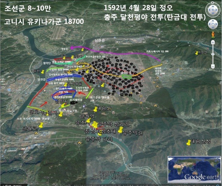 임진왜란 당시 가장 무능한 전투 중 원균의 칠천량 해전이 있고, 신립의 탄금대 전투가 있습니다. 전투는 중반까지 충주천 이남 달천평야에서 벌어졌는데 탄금대에서 최후를 맞이했기에 탄금대 전투로 불리게 된 것으로 봅니다. 임진왜란 최초의 대규모 야전이며 일본군 예상 1만8천 정도와 조선군은 여러 의견이 있지만 기록으로 보아 8천일 확률이 높습니다.