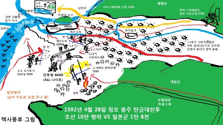 이 전투로인해 조선군은 크나큰 손실을 입었던것또한 사실이죠. 하지만 무작정 패배했다고 비판만 하시는분들도 생각은 하셔야할것이 조총이라는 신무기에 누가 감히 28만이라는 대군이나 바다를 건너올거라고 생각했을까요? 신립장군도 나름 당대의 명장이었고 북방의 거친 여진족들에겐 공포의 대상일정도로 승전도 많이 거둔 장수였죠.