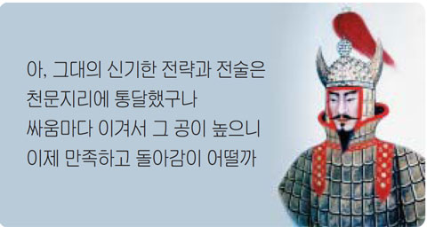 을지문덕 장군은 귀족의 힘이 막강했던 고구려에서 혜성처럼 등장, 모든 군권을 차지 후, 중국 수나라 양제가 고구려 정복을 위해 이끈 압도적인 군사의 30만 별동대를 2,700명만을 남기고 모조리 몰살시키는 전쟁 역사상 전부 후무한 대승리 기록 이후 홀연히 사라져버렸습니다.